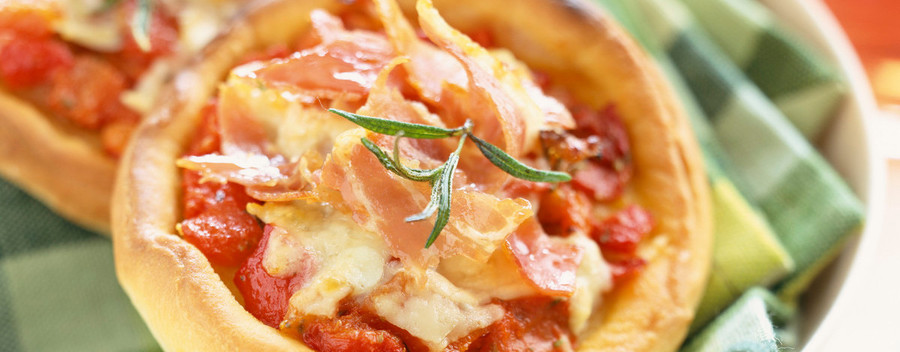 Baby Pizzas with Cheese, Tomato Sauce and Bacon